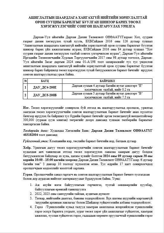 Төсөл сонгон шалгаруулалтын урилга Төсөл сонгон шалгаруулалтын нэр: Дархан-Уул аймгийн Дархан сумын 4, 5 дугаар багийн нутаг дэвсгэрт ашиглалтын шаардлага хангахгүй нийтийн зориулалттай орон сууцны барилгыг буулган шинээр барих төсөл хэрэгжүүлэгчийг сонгон шалгаруулах. Төсөл сонгон шалгаруулалт нь дараах багцуудаас бүрдэнэ: № БАГЦ БАЙРШИЛ 1 ДАУ_ДС4-200E Дархан сумын 4 дүгээр…