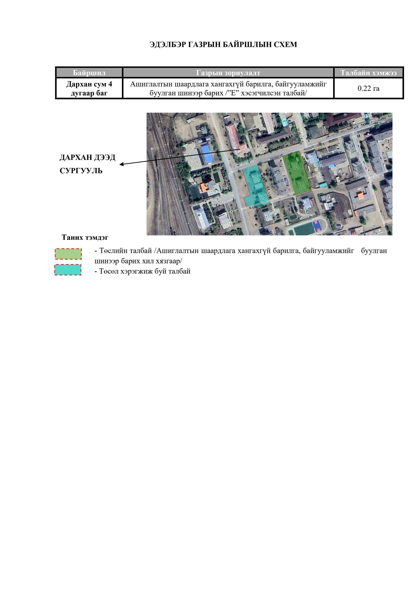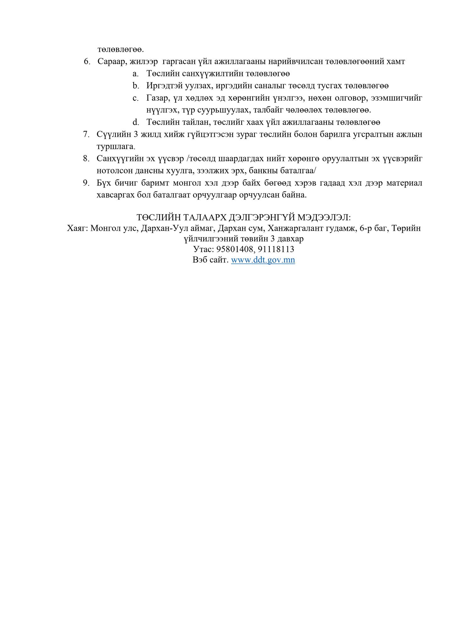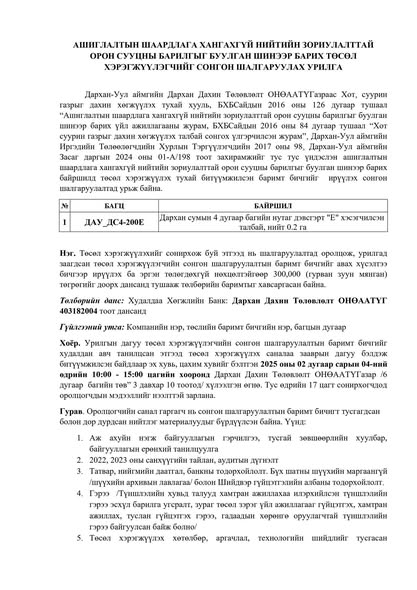 Дархан-Уул аймгийн Дархан Дахин Төлөвлөлт ОНӨААТҮГазраас Хот, суурин газрыг дахин хөгжүүлэх тухай хууль, БХБСайдын 2016 оны 126 дугаар тушаал “Ашиглалтын шаардлага хангахгүй нийтийн зориулалттай орон сууцны барилгыг буулган шинээр барих үйл ажиллагааны журам, БХБСайдын 2016 оны 84 дугаар тушаал “Хот суурин газрыг дахин хөгжүүлэх талбай сонгох үлгэрчилсэн журам”, Дархан-Уул аймгийн Иргэдийн Төлөөлөгчдийн Хурлын Тэргүүлэгчдийн 2017 оны 98 дугаар тогтоол, Дархан-Уул аймгийн Засаг даргын 2024 оны 01-А/198 тоот захирамжийг тус тус үндэслэн ашиглалтын шаардлага хангахгүй нийтийн зориулалттай орон сууцны барилгыг буулган шинээр барих байршилд төсөл хэрэгжүүлэх тухай битүүмжилсэн баримт бичгийг ирүүлэх сонгон шалгаруулалтад урьж байна.